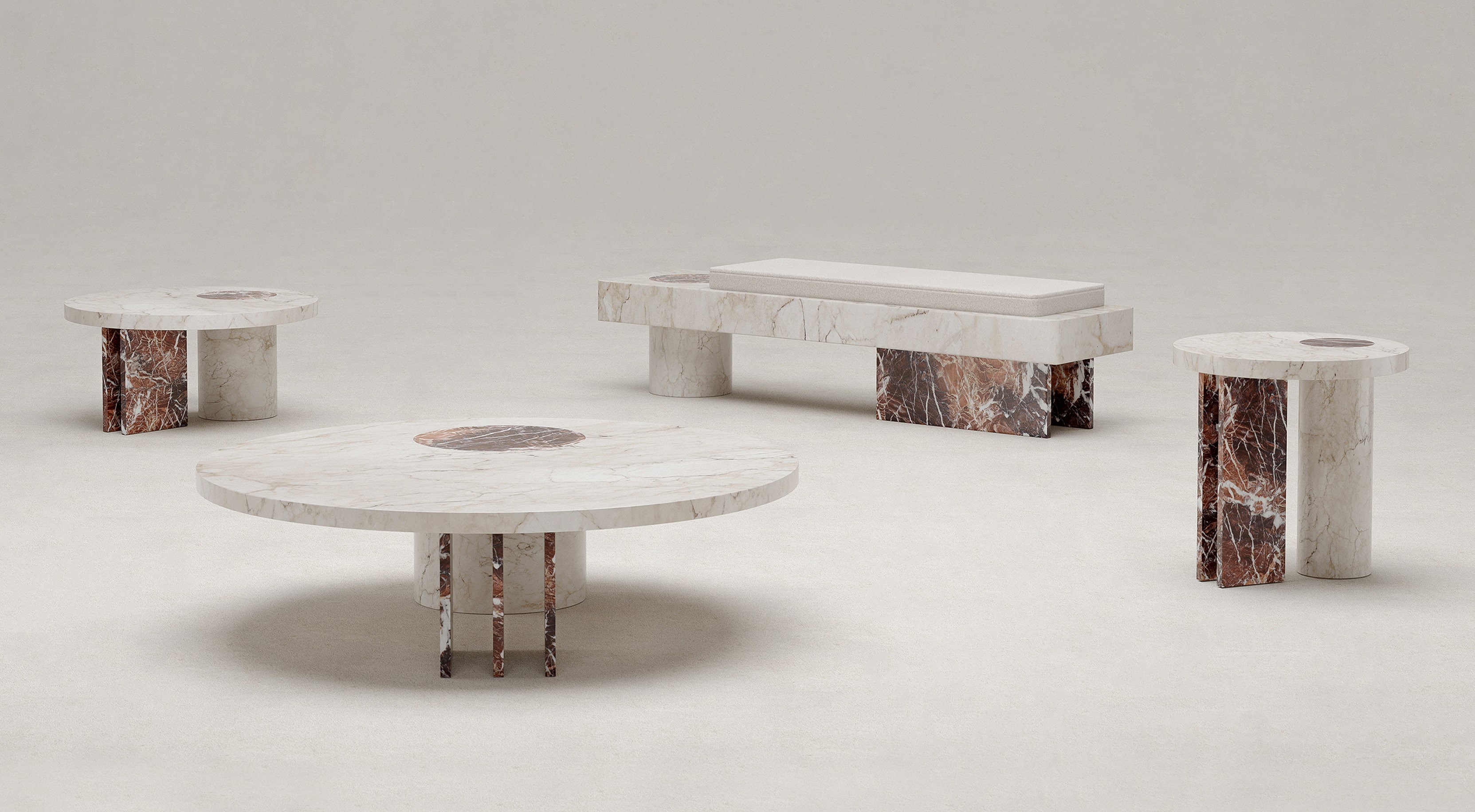 Materials: marble, walnut burl / Eramosa marble, fabric