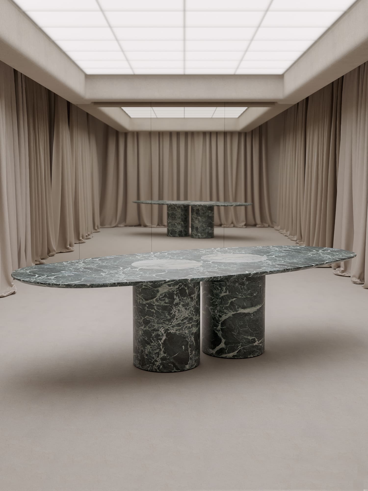 Salvante D1 dining table — a new addition to the Salvante table set. The table showcases two cylindrical legs that support a wavy-edged tabletop featuring the signature marble disc inlay of the Salvante collection.